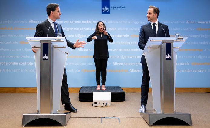 Demissionair premier mark rutte tijdens een eerdere coronapersconferentie met achter hem gebarentolk irma sluis persconferentie corona. De geliefde doventolk irma sluis zal donderdagavond niet tolken bij de persconferentie over de coronamaatregelen.